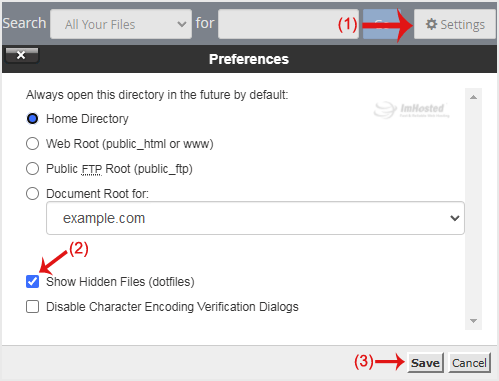 4. If the .htaccess file is not visible, click Settings in the top right corner of the File Manager. In the settings window, check the box next to Show Hidden Files (Dotfiles) and click Save. The .htaccess file should now be visible. If it is still not there, you can create a new one.