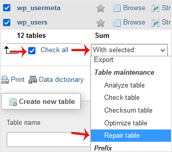 4. Scroll down and mark Check All. Then click on the drop-down arrow and select Repair table.